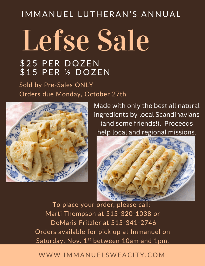 - Later order pick ups can be requested but are at the discretion of church staff and volunteers being available. Lefse will be frozen if not picked up on Saturday or Sunday.